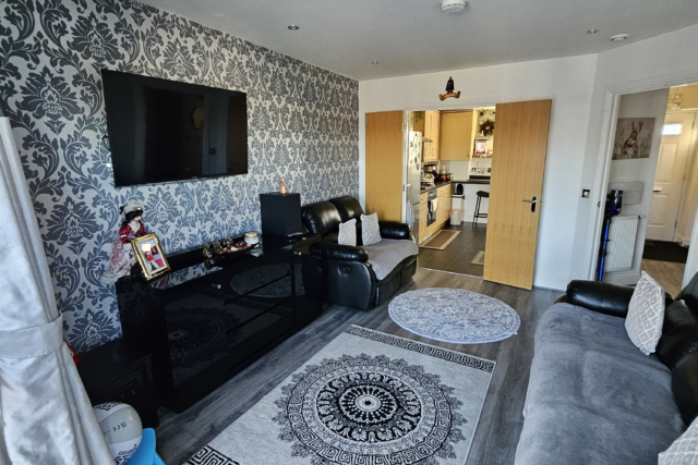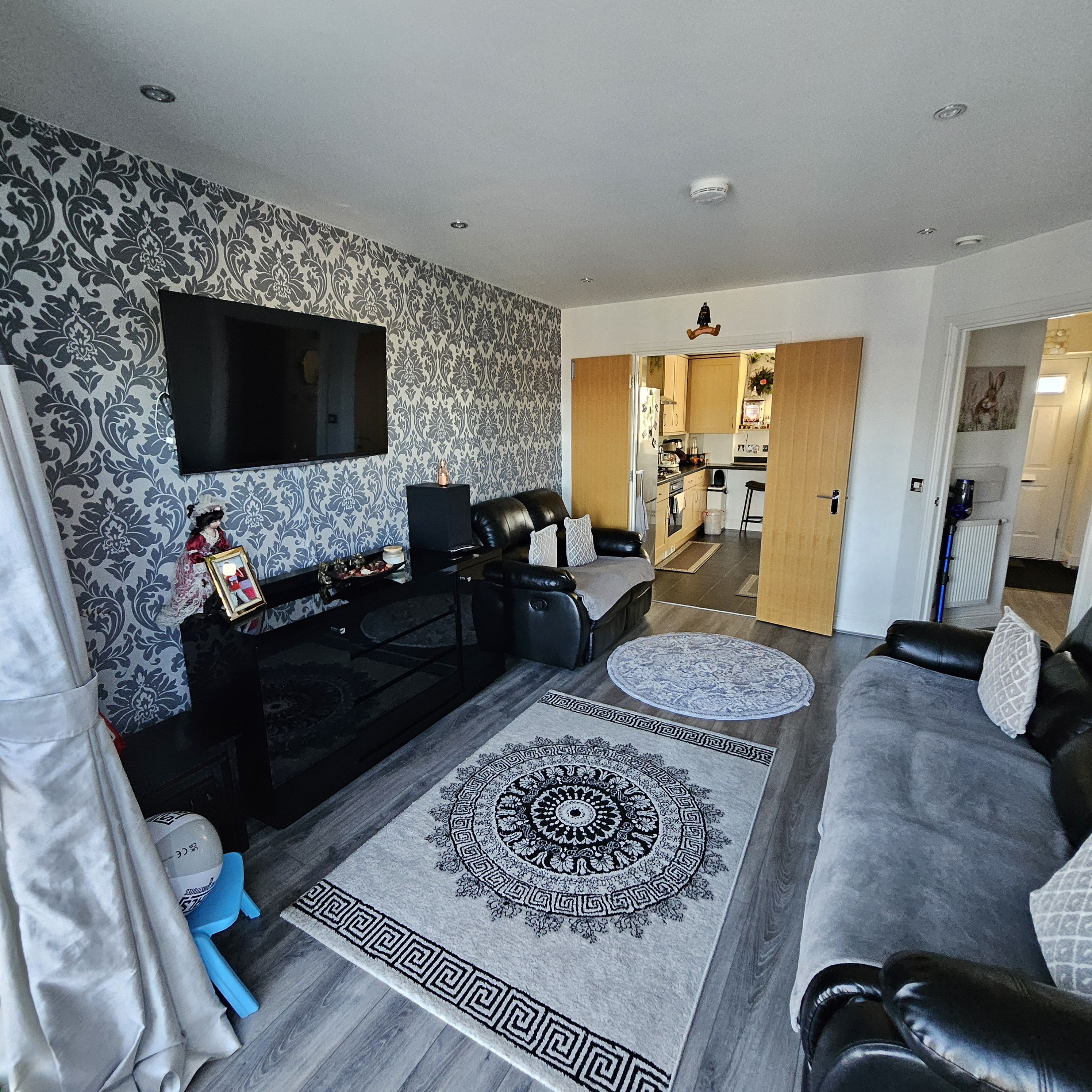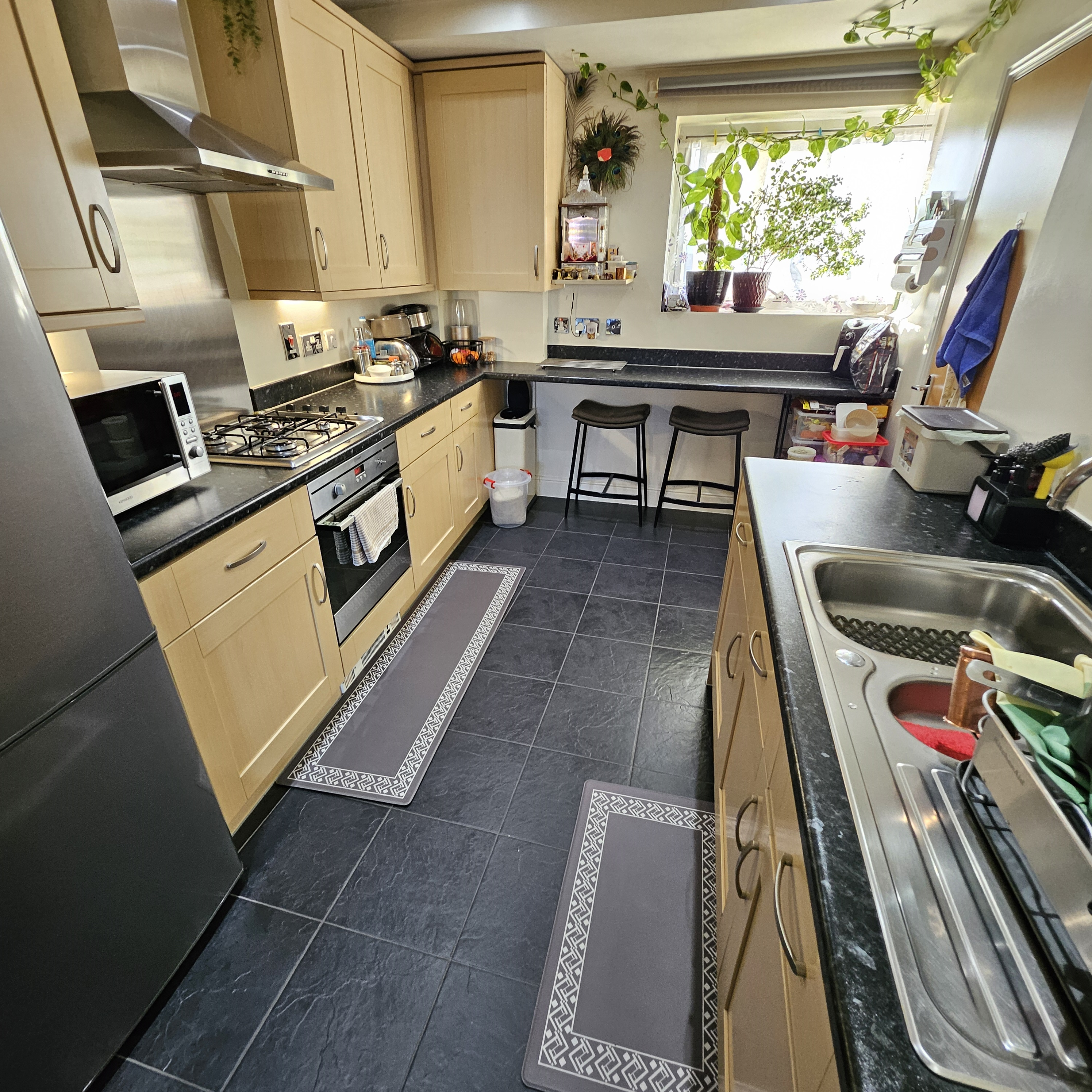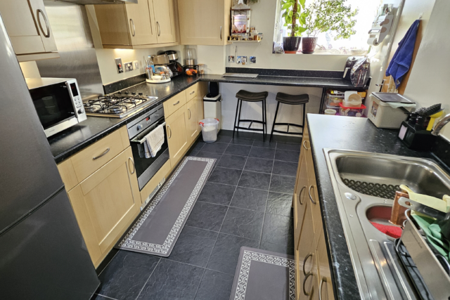 Internally: The property opens into a hallway leading to a modern kitchen on the right, featuring dual entrances that create a seamless flow between the hallway and the lounge. The kitchen is equipped with a gas cooker, built-in oven, extractor fan, and 10 base units offering ample storage space. It also includes a breakfast bar, stainless steel sink, and a large window that fills the room with natural light.