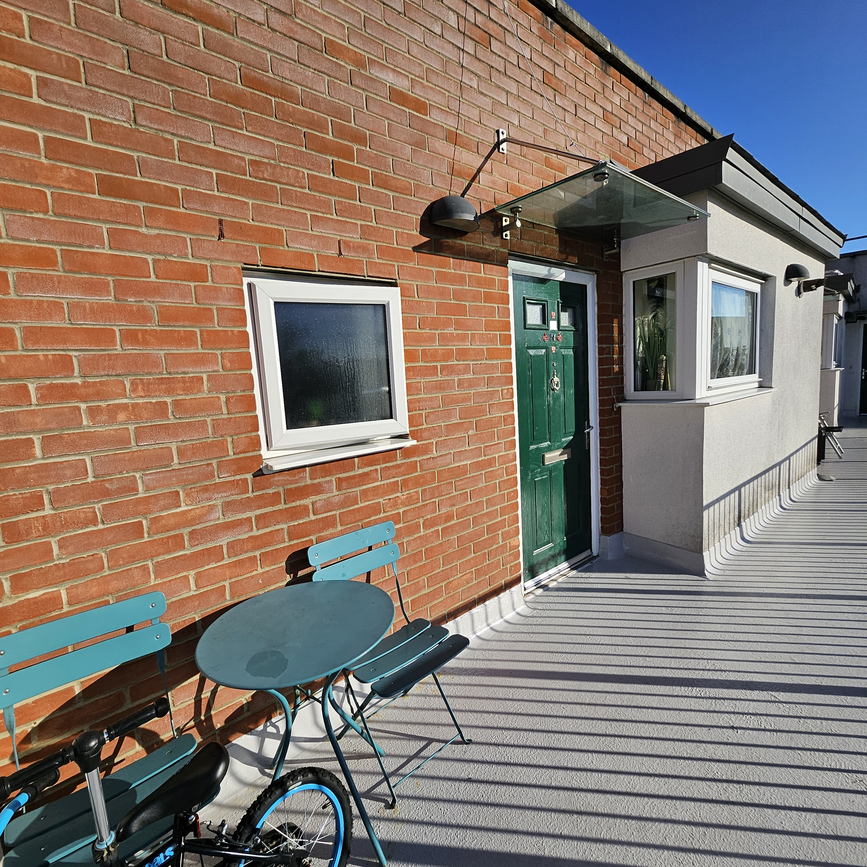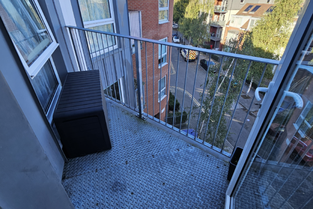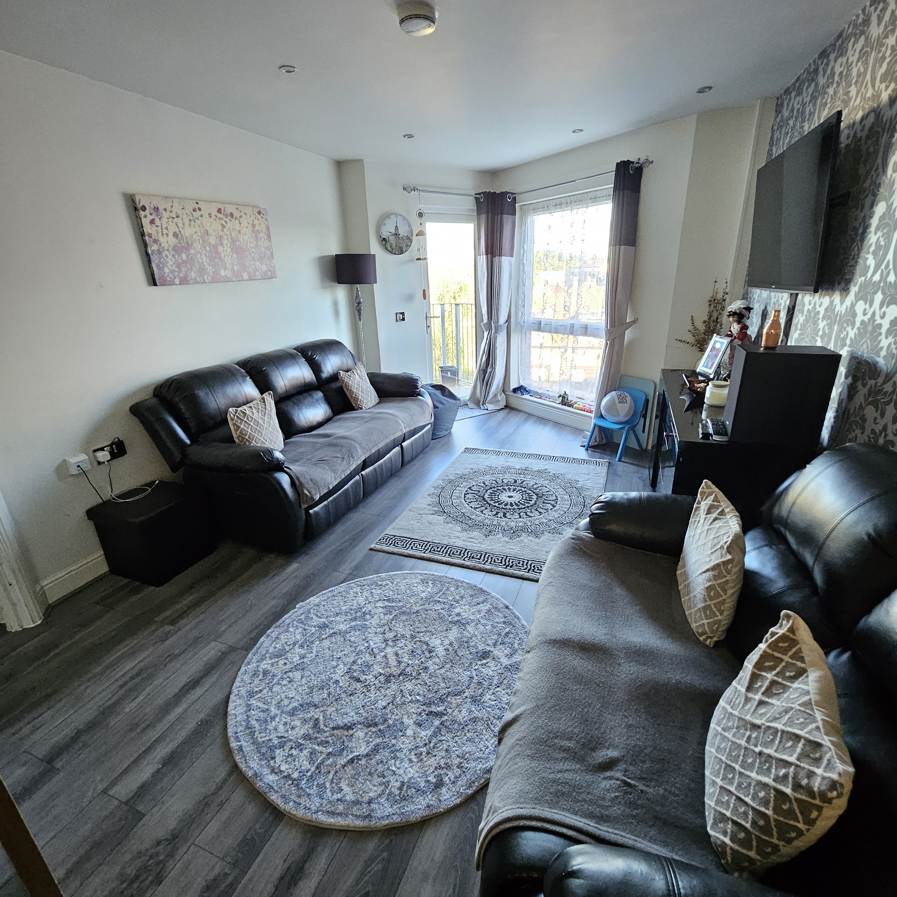 The spacious lounge, bathed in light from its large window, provides access to a balcony with views over the building’s front entrance and car park.