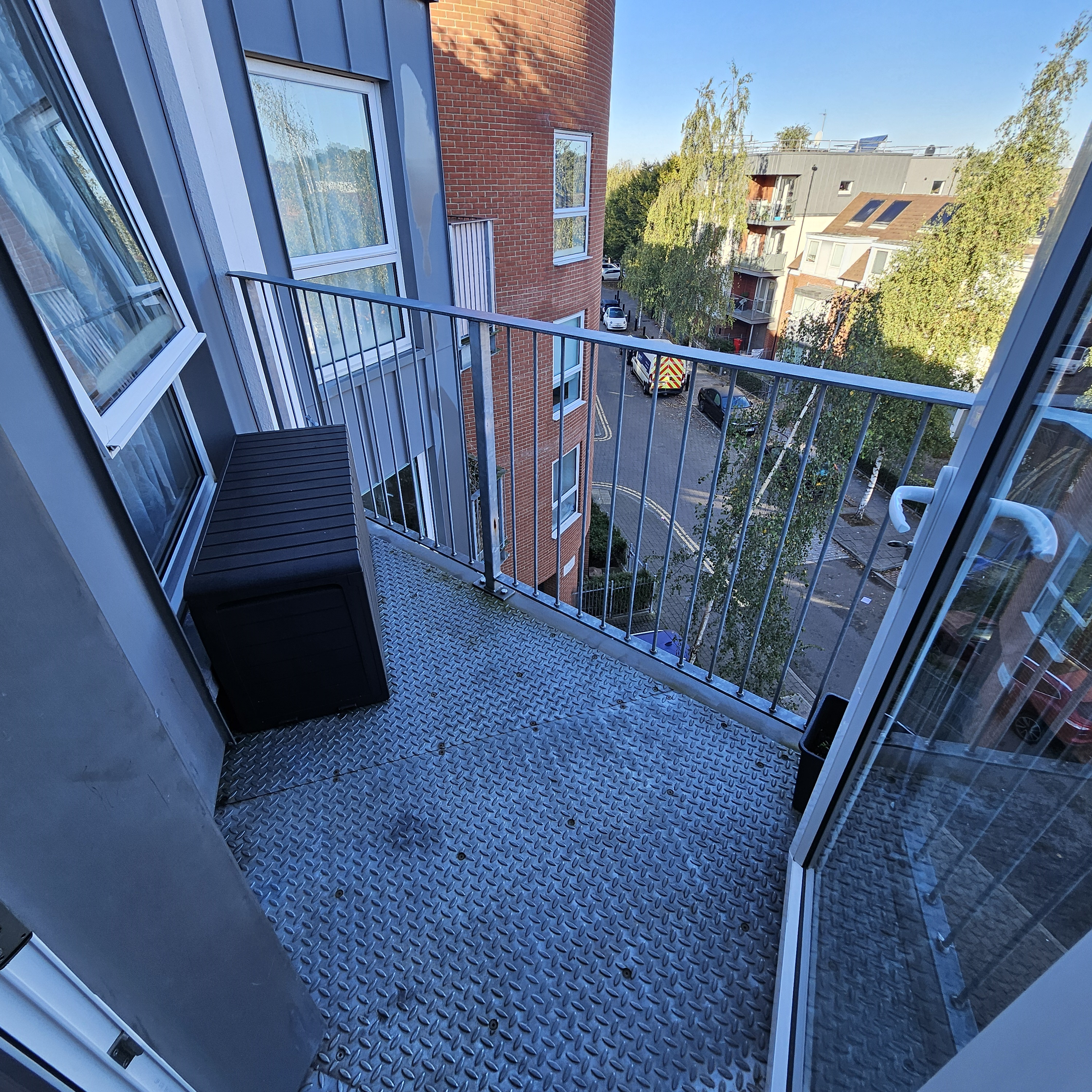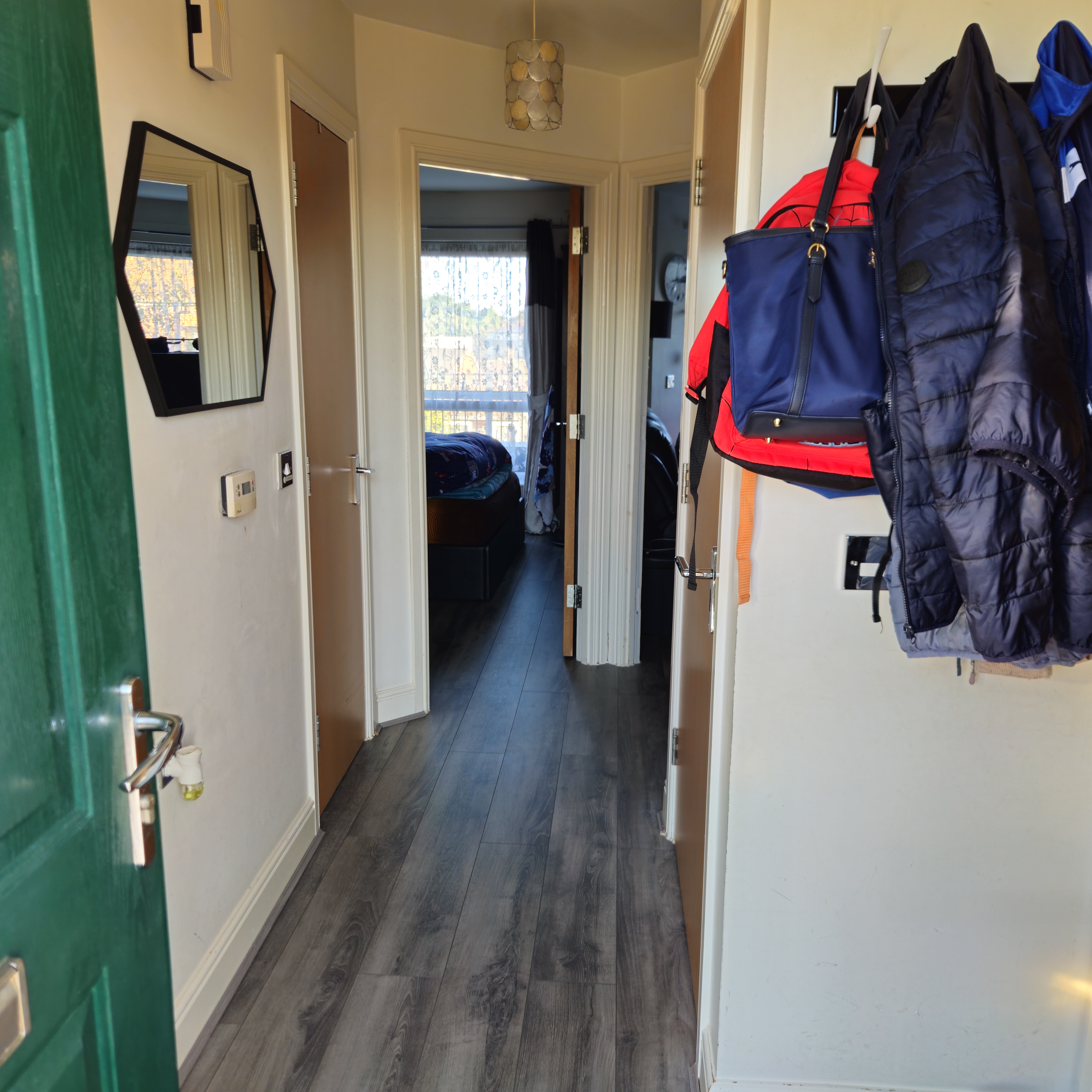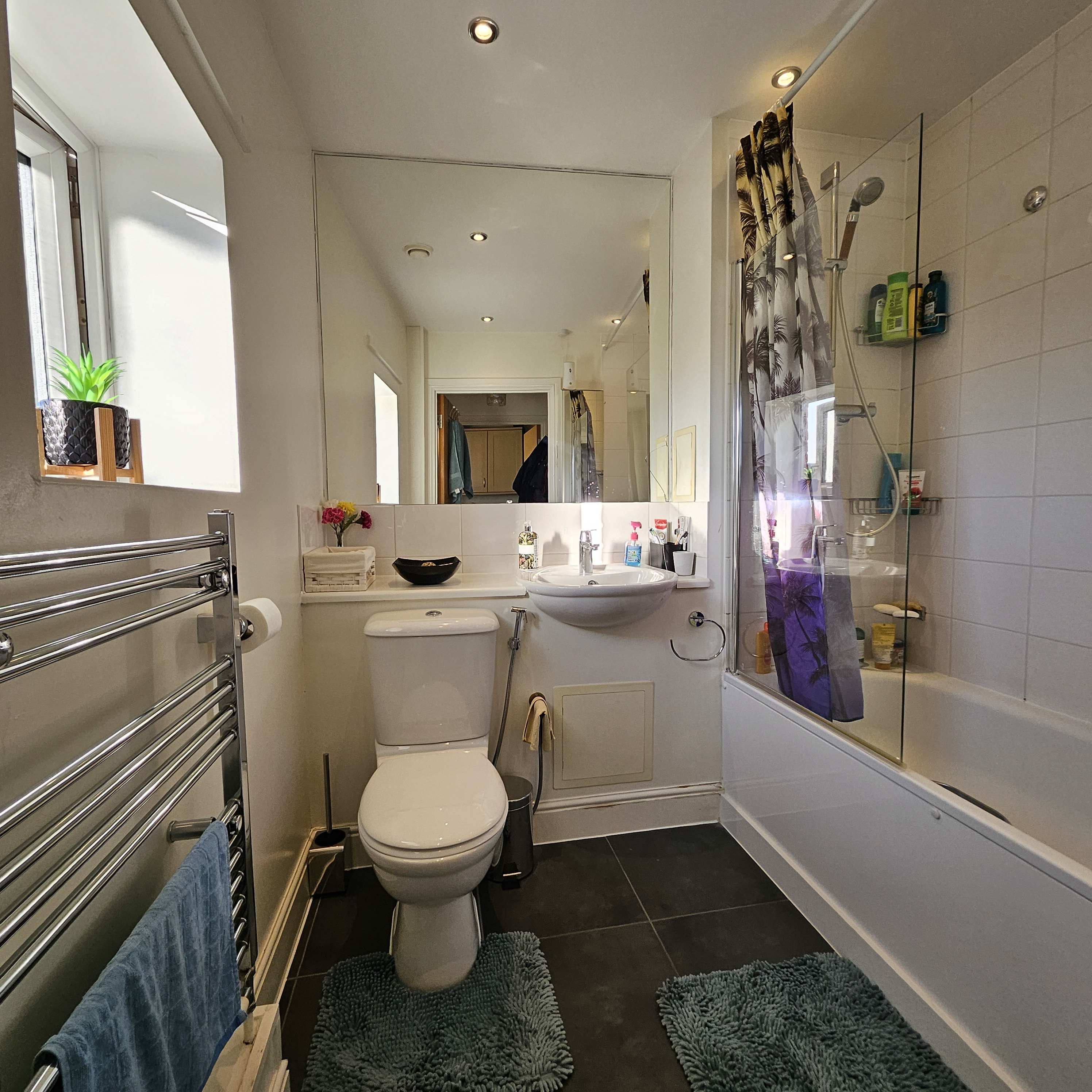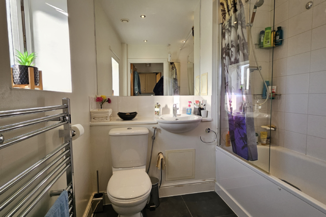 Off the hallway, you’ll find a generously sized double bedroom with built-in storage and a window overlooking the balcony. The bathroom, conveniently located near the bedroom, features a three-piece suite including a bathtub. Additional storage is provided by two hallway cupboards, one of which houses a washing machine and the other a Megaflow system.